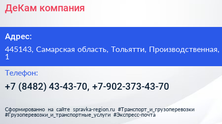 ДеКам, компания по адресу 445143, Самарская область, Тольятти, Производственная, 1 в дальнейшем Организация, размещена в следующих категориях: