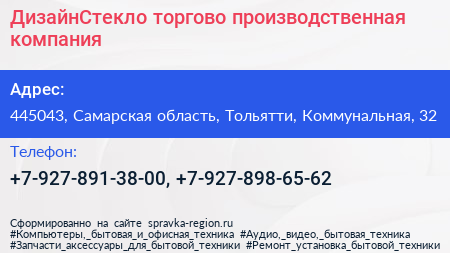 ДизайнСтекло, торгово-производственная компания по адресу 445043, Самарская область, Тольятти, Коммунальная, 32 в дальнейшем Организация, размещена в следующих категориях: