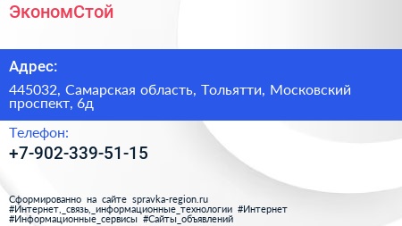 ЭкономСтой по адресу 445032, Самарская область, Тольятти, Московский проспект, 6д в дальнейшем Организация, размещена в следующих категориях: