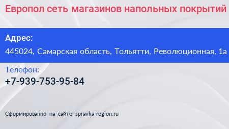 Европол, сеть магазинов напольных покрытий по адресу 445024, Самарская область, Тольятти, Революционная, 1а в дальнейшем Организация, размещена в следующих категориях: