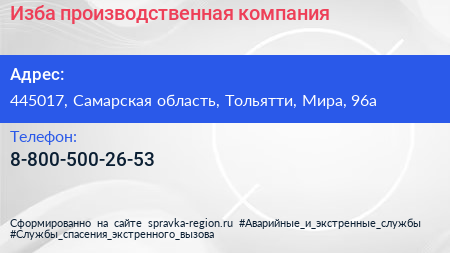 Изба, производственная компания по адресу 445017, Самарская область, Тольятти, Мира, 96а в дальнейшем Организация, размещена в следующих категориях: