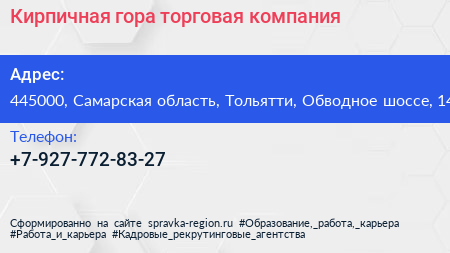 Кирпичная гора, торговая компания по адресу 445000, Самарская область, Тольятти, Обводное шоссе, 14 в дальнейшем Организация, размещена в следующих категориях: