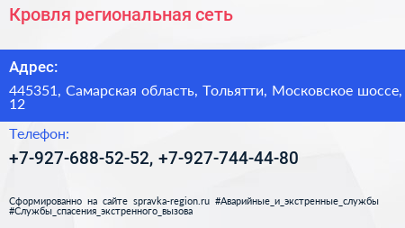 Кровля, региональная сеть по адресу 445351, Самарская область, Тольятти, Московское шоссе, 12 в дальнейшем Организация, размещена в следующих категориях: