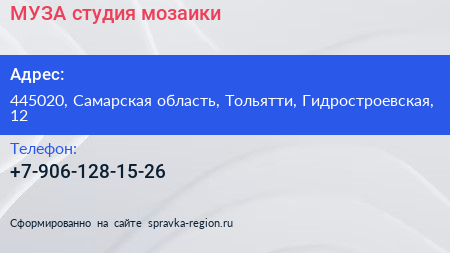 МУЗА, студия мозаики по адресу 445020, Самарская область, Тольятти, Гидростроевская, 12 в дальнейшем Организация, размещена в следующих категориях: