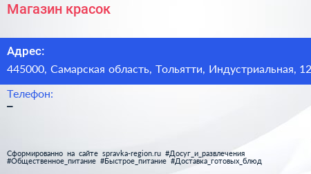 Магазин красок по адресу 445000, Самарская область, Тольятти, Индустриальная, 12 в дальнейшем Организация, размещена в следующих категориях: