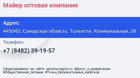 Майер, оптовая компания по адресу 445043, Самарская область, Тольятти, Коммунальная, 28 в дальнейшем Организация, размещена в следующих категориях: