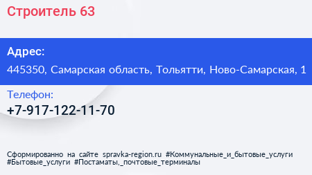 Строитель 63 по адресу 445350, Самарская область, Тольятти, Ново-Самарская, 1 в дальнейшем Организация, размещена в следующих категориях: