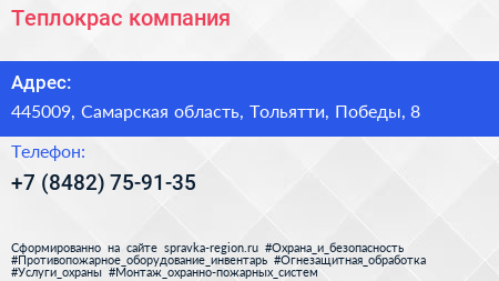 Теплокрас, компания по адресу 445009, Самарская область, Тольятти, Победы, 8 в дальнейшем Организация, размещена в следующих категориях: