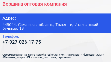 Вершина, оптовая компания по адресу 445044, Самарская область, Тольятти, Итальянский бульвар, 18 в дальнейшем Организация, размещена в следующих категориях:
