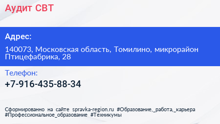 Аудит СВТ по адресу 140073, Московская область, Томилино, микрорайон Птицефабрика, 28 в дальнейшем Организация, размещена в следующих категориях: