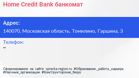 Home Credit Bank, банкомат по адресу 140070, Московская область, Томилино, Гаршина, 3 в дальнейшем Организация, размещена в следующих категориях: