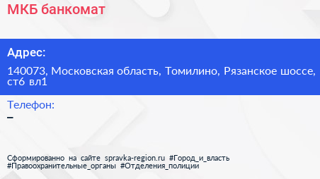МКБ, банкомат по адресу 140073, Московская область, Томилино, Рязанское шоссе, ст6 вл1 в дальнейшем Организация, размещена в следующих категориях: