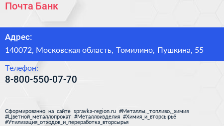 Почта Банк по адресу 140072, Московская область, Томилино, Пушкина, 55 в дальнейшем Организация, размещена в следующих категориях: