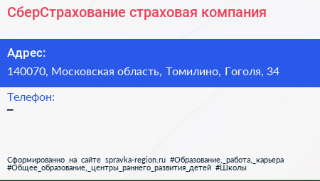СберСтрахование, страховая компания по адресу 140070, Московская область, Томилино, Гоголя, 34 в дальнейшем Организация, размещена в следующих категориях: