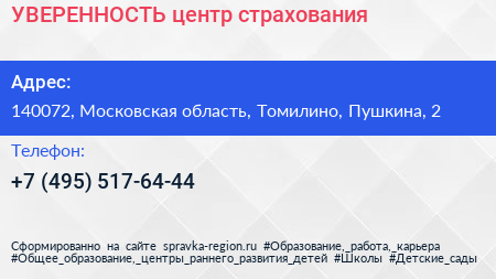УВЕРЕННОСТЬ, центр страхования по адресу 140072, Московская область, Томилино, Пушкина, 2 в дальнейшем Организация, размещена в следующих категориях: