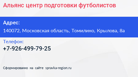 Альянс, центр подготовки футболистов по адресу 140072, Московская область, Томилино, Крылова, 8а в дальнейшем Организация, размещена в следующих категориях: