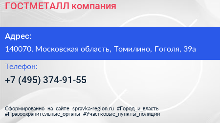 ГОСТМЕТАЛЛ, компания по адресу 140070, Московская область, Томилино, Гоголя, 39а в дальнейшем Организация, размещена в следующих категориях:
