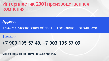 Интерпластик 2001, производственная компания по адресу 140070, Московская область, Томилино, Гоголя, 39а в дальнейшем Организация, размещена в следующих категориях: