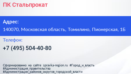 ПК Стальпрокат по адресу 140070, Московская область, Томилино, Пионерская, 1Б в дальнейшем Организация, размещена в следующих категориях: