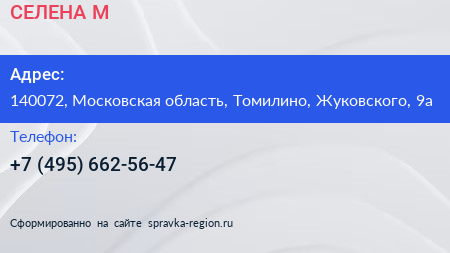 СЕЛЕНА-М по адресу 140072, Московская область, Томилино, Жуковского, 9а в дальнейшем Организация, размещена в следующих категориях: