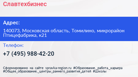 Славтехбизнес по адресу 140073, Московская область, Томилино, микрорайон Птицефабрика, к21 в дальнейшем Организация, размещена в следующих категориях: