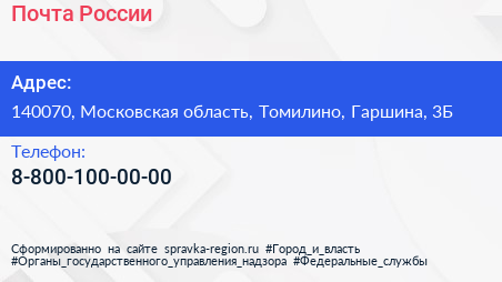 Почта России по адресу 140070, Московская область, Томилино, Гаршина, 3Б в дальнейшем Организация, размещена в следующих категориях: