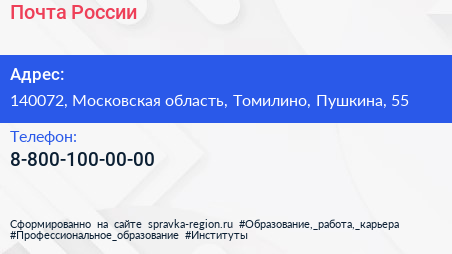 Почта России по адресу 140072, Московская область, Томилино, Пушкина, 55 в дальнейшем Организация, размещена в следующих категориях: