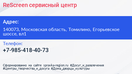 ReScreen, сервисный центр по адресу 140073, Московская область, Томилино, Егорьевское шоссе, вл1 в дальнейшем Организация, размещена в следующих категориях:
