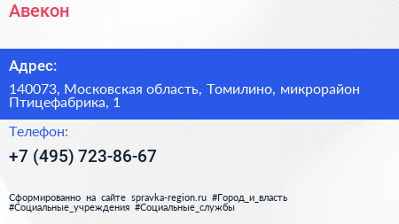 Авекон по адресу 140073, Московская область, Томилино, микрорайон Птицефабрика, 1 в дальнейшем Организация, размещена в следующих категориях: