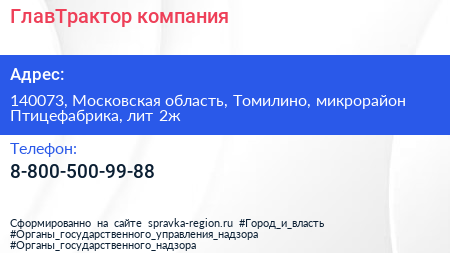 ГлавТрактор, компания по адресу 140073, Московская область, Томилино, микрорайон Птицефабрика, лит 2ж в дальнейшем Организация, размещена в следующих категориях: