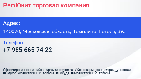 РефЮнит, торговая компания по адресу 140070, Московская область, Томилино, Гоголя, 39а в дальнейшем Организация, размещена в следующих категориях: