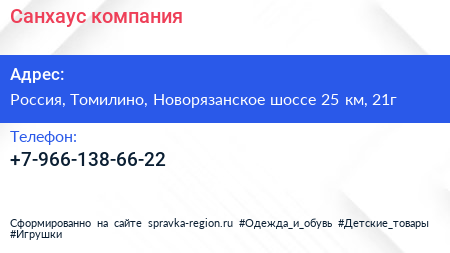 Санхаус, компания по адресу Строительный рынок Строймаркет на Рязанке, Новорязанское шоссе (дублёр), Чкалово, городской округ Люберцы, Московская область, Центральный федеральный округ, 140073, Россия в дальнейшем Организация, размещена в следующих категориях: