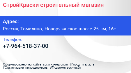 СтройКраски, строительный магазин по адресу Строительный рынок Строймаркет на Рязанке, Новорязанское шоссе (дублёр), Чкалово, городской округ Люберцы, Московская область, Центральный федеральный округ, 140073, Россия в дальнейшем Организация, размещена в следующих категориях:
