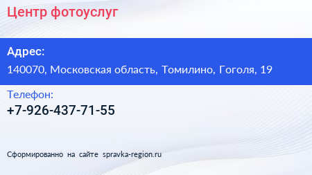 Центр фотоуслуг по адресу 140070, Московская область, Томилино, Гоголя, 19 в дальнейшем Организация, размещена в следующих категориях: