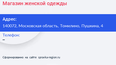 Магазин женской одежды по адресу 140072, Московская область, Томилино, Пушкина, 4 в дальнейшем Организация, размещена в следующих категориях: