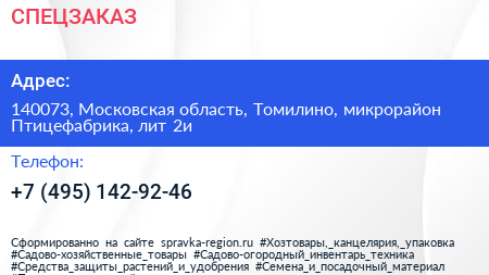 СПЕЦЗАКАЗ по адресу 140073, Московская область, Томилино, микрорайон Птицефабрика, лит 2и в дальнейшем Организация, размещена в следующих категориях: