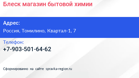 Блеск, магазин бытовой химии по адресу Михаил Лермонтов, 7, 1-й квартал, Жилой комплекс «Томилино», Жилино-1, городской округ Люберцы, Московская область, Центральный федеральный округ, 140072, Россия в дальнейшем Организация, размещена в следующих категориях: