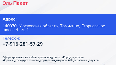 Эль-Пакет по адресу 140070, Московская область, Томилино, Егорьевское шоссе 4 км, 1 в дальнейшем Организация, размещена в следующих категориях: