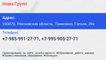 Нова Групп по адресу 140070, Московская область, Томилино, Гоголя, 39а в дальнейшем Организация, размещена в следующих категориях: