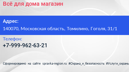 Всё для дома, магазин по адресу 140070, Московская область, Томилино, Гоголя, 31/1 в дальнейшем Организация, размещена в следующих категориях: