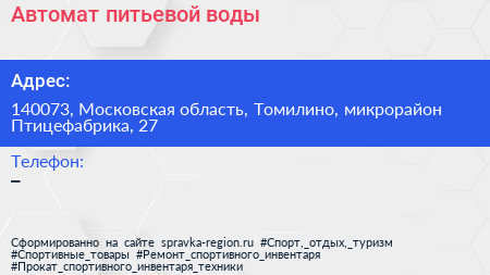 Автомат питьевой воды по адресу 140073, Московская область, Томилино, микрорайон Птицефабрика, 27 в дальнейшем Организация, размещена в следующих категориях: