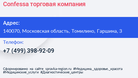 Confessa, торговая компания по адресу 140070, Московская область, Томилино, Гаршина, 3 в дальнейшем Организация, размещена в следующих категориях: