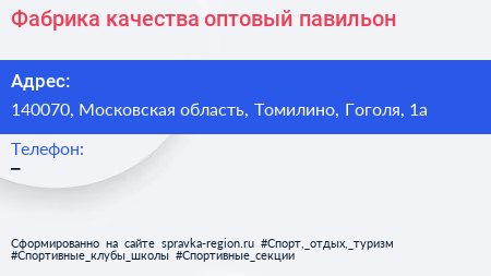 Фабрика качества, оптовый павильон по адресу 140070, Московская область, Томилино, Гоголя, 1а в дальнейшем Организация, размещена в следующих категориях: