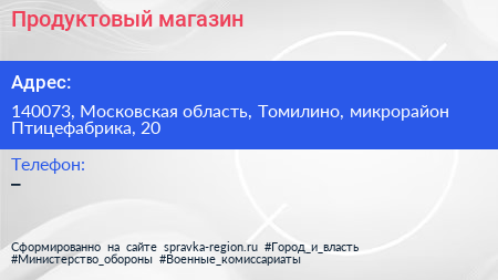 Продуктовый магазин по адресу 140073, Московская область, Томилино, микрорайон Птицефабрика, 20 в дальнейшем Организация, размещена в следующих категориях:
