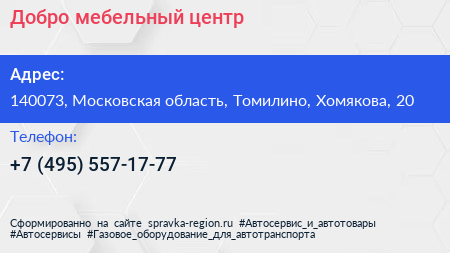Добро, мебельный центр по адресу 140073, Московская область, Томилино, Хомякова, 20 в дальнейшем Организация, размещена в следующих категориях: