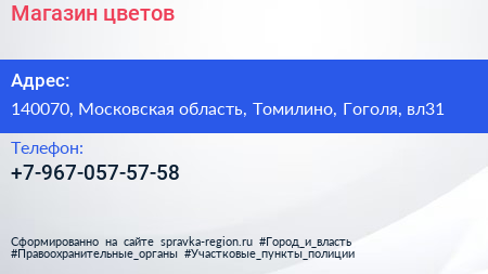 Магазин цветов по адресу 140070, Московская область, Томилино, Гоголя, вл31 в дальнейшем Организация, размещена в следующих категориях: