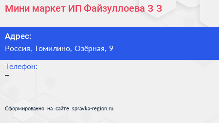 Мини-маркет, ИП Файзуллоева З.З. по адресу 9, Озёрная улица, Жилой комплекс «Люберцы 2018», Зенино, Люберцы, городской округ Люберцы, Московская область, Центральный федеральный округ, 140016, Россия в дальнейшем Организация, размещена в следующих категориях: