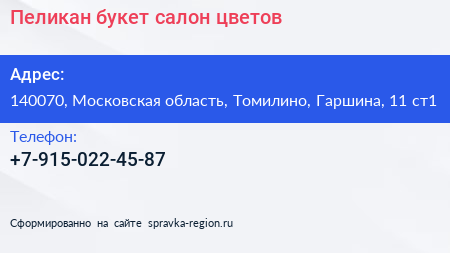 Пеликан-букет, салон цветов по адресу 140070, Московская область, Томилино, Гаршина, 11 ст1 в дальнейшем Организация, размещена в следующих категориях: