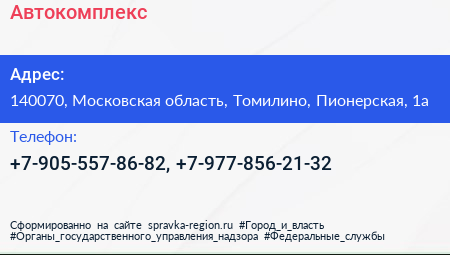 Автокомплекс по адресу 140070, Московская область, Томилино, Пионерская, 1а в дальнейшем Организация, размещена в следующих категориях: