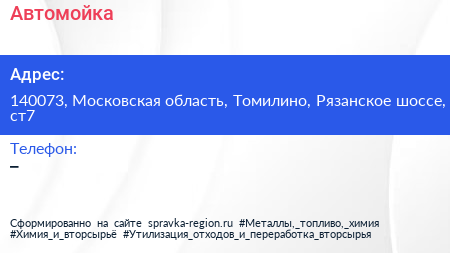 Автомойка по адресу 140073, Московская область, Томилино, Рязанское шоссе, ст7 в дальнейшем Организация, размещена в следующих категориях: